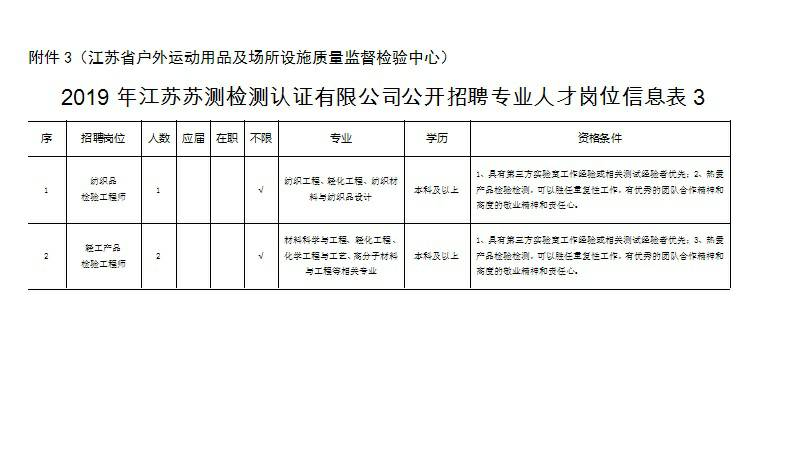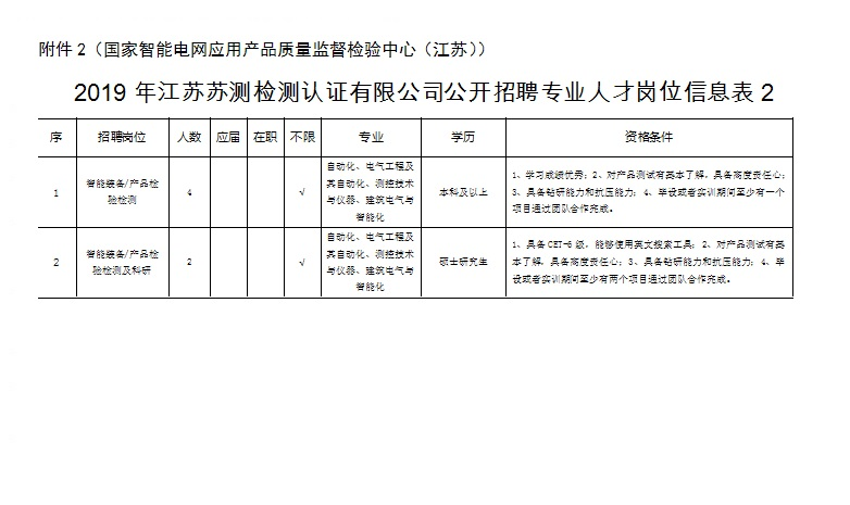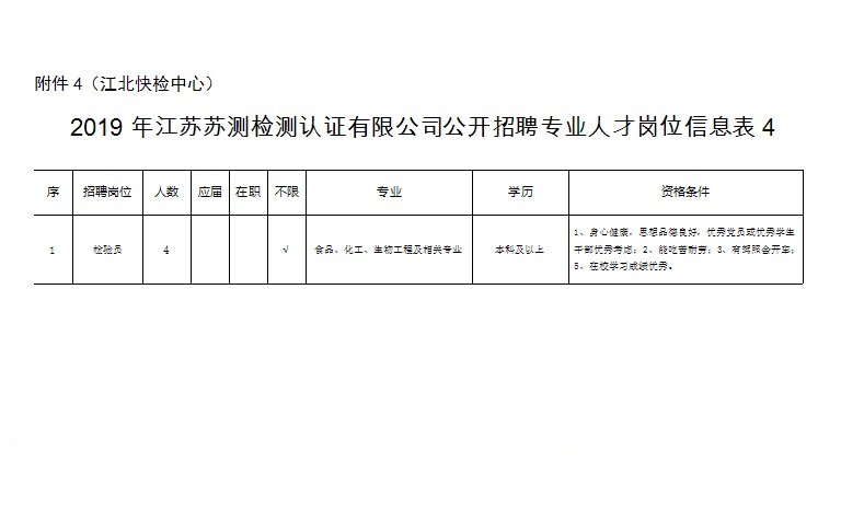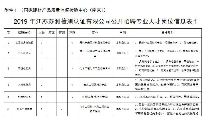 根據(jù)工作需要,江蘇蘇測檢測認證有限公司(南京市產(chǎn)品質(zhì)量監(jiān)督檢驗院全資子公司)委托中智江蘇經(jīng)濟技術合作有限公司面向社會公開招聘24名《2019年江蘇蘇測檢測認證有限公司公開招聘專業(yè)人才公告》崗位工作人員,工作地點覆蓋南京市,確定聘用后根據(jù)工作需要統(tǒng)一安排,現(xiàn)將有關事項公告如下: 一、招聘崗位及人數(shù) 江蘇蘇測檢測認證有限公司包括水泥制品檢驗員、分析檢驗員、環(huán)境檢驗員、木材檢驗員、機械檢驗員、化工氣體主管、化工氣體檢驗員、智能裝備/產(chǎn)品檢驗檢測、智能裝備/產(chǎn)品檢驗檢測及科研、紡織品檢驗工程師、輕工產(chǎn)品檢驗工程師等崗位共招聘24人。 二、資格條件 1.具有中華人民共和國國籍,擁護黨的路線、方針、政策; 2.遵紀守法,品行端正,具有良好的職業(yè)道德; 3.無違法違紀行為,具備正常履行工作職責的身體條件; 4.具備崗位資格條件(詳見附件:《2019年江蘇蘇測檢測認證有限公司公開招聘專業(yè)人才崗位信息表》) 三、簡歷投遞方式 報名方式:本次招聘采取電子郵件報名方式。電子郵件報名時,請將郵件主題及應聘文檔按“2018年江蘇蘇測工作人員招聘材料+姓名+崗位”格式命名。 四、聘者需填寫個人簡歷或者附件5-《2019年江蘇蘇測檢測認證有限公司勞務外包項目報名表》,并提交求職材料。求職材料包含:(1)登記表或個人簡歷上填寫內(nèi)容的證明材料(身份證、畢業(yè)證、學位證、職稱證、主要科研成果證明及獲獎證書等材料原件掃描件/復印件);(2)有海外學習工作經(jīng)歷的需提供留學回國證明、學歷認證等材料原件掃描件/復印件。(3)應聘崗位所需提供的其他材料原件及復印件。 應聘者請將個人簡歷或者附件5-《2019年江蘇蘇測檢測認證有限公司勞務外包項目報名表》及應聘證明材料原件掃描并制作成一份PDF格式材料后,發(fā)送至郵箱:617025593@qq.com,相關咨詢電話:025-86673817 凌老師(工作日9:00-17:00,節(jié)假日除外)。 五、資格審查 1.初審。根據(jù)應聘者提供的各種求職材料進行資格審查,應聘者提供的應聘材料須真實準確,一經(jīng)發(fā)現(xiàn)應聘材料存在虛假不實之處,經(jīng)核實,取消應聘者應聘資格,責任由應聘人員自行承擔。 2.復審?,F(xiàn)場對初審合格的應聘者提供的各種求職材料原件進行資格審查,交驗證明材料原件。符合要求的準許參加面試,不符合要求的取消其面試資格。 六、筆試、面試 符合資格審查的候選人,將統(tǒng)一組織開展筆試、面試,進行擇優(yōu)選取。 七、體檢、錄用 根據(jù)崗位需要,經(jīng)考試、政審、體檢合格后確定聘用候選人。通過中智江蘇經(jīng)濟技術合作有限公司實行勞務外包管理。